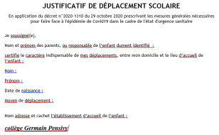 Nouvelle Attestation pour les parents ou les élèves dans le cadre d’un déplacement scolaire pendant le couvre feu